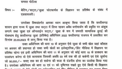 रायपुर। पुलिस ने समाचार पत्रों में सट्टा के विज्ञापन पर प्रतिबंध लगाया है। साथ ही एडवाइजरी भी जारी की है।…