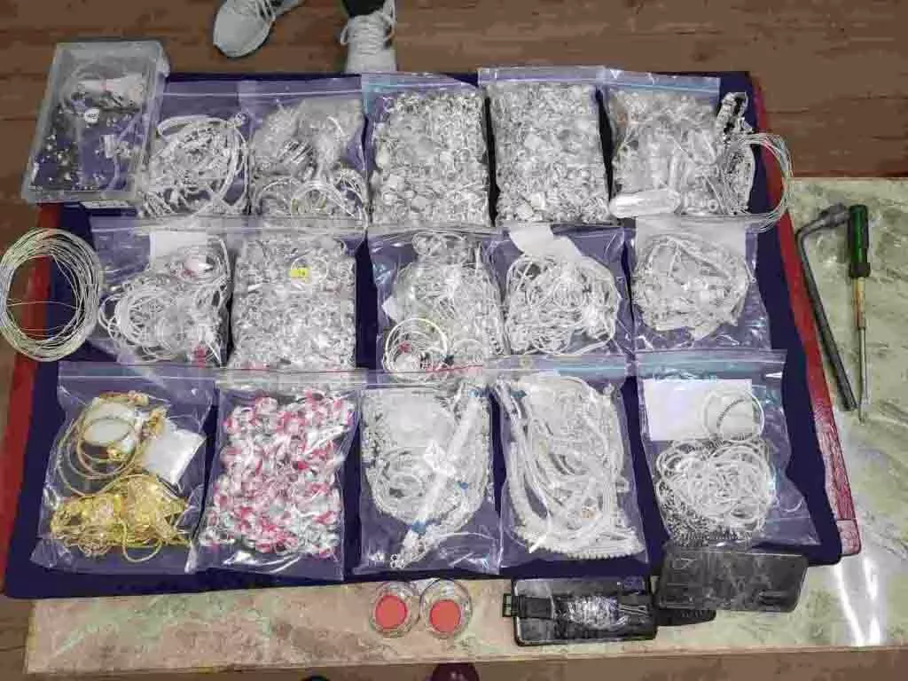 कोरिया ज्वेलरी शॉप के शटर का लॉक तोड़कर लाखों का चांदी चोरी करने वाले गिरोह का पुलिस ने पर्दाफाश किया है. चोरी की वारदात के 72 घंटे के भीतर ही मामले के 4 आरोपियों को पुलिस ने गिरफ्तार किया है. ये सभी आरोपी मध्य प्रदेश के सिंगरौली के रहने वाले हैं. यह गिरोह फैक्ट्री में काम ढूढ़ने के बहाने चोरी के लिए रेकी करता था. अंतरराज्यीय आरोपियों ने पहली बार छत्तीसगढ़ में चोरी और पहली बार में ही पकड़े गए. पुलिस ने आरोपियों के कब्जे से चोरी किये गए लाखों के जेवर और इंडिगो CS कार भी जब्त किया है. बताया जा रहा है कि आरोपियों ने पहले दिन सूरजपुर के भैयाथान में भी चोरी का प्रयास किया गया था. जानकारी के अनुसार, कोरिया जिले के पटना थाना अंतर्गत रनई गांव स्थित लालकुवर ज्वेलर्स एण्ड मेटालाइज शोरूम के मालिक ने 19 फरवरी को रिपोर्ट दर्ज कराई की शटर का लॉक तोड़कर अज्ञात चोरों ने सेंधमारी की है.