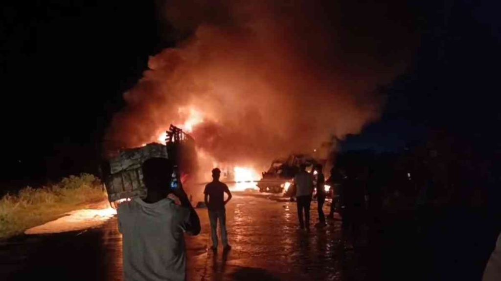 पुलिस ने स्थानीय ग्रामीणों की मदद से आग पर काबू पाने का प्रयास किया पर विफल रहे. इस हादसे में दोनों गाड़ियां जलकर राख हो गई. तीसरी गाड़ी को भी बड़ा नुकसान हुआ है. आग के चलते दोनों वाहन चालक घायल हुए हैं. एक की हालत गंभीर बताई जा रही है.