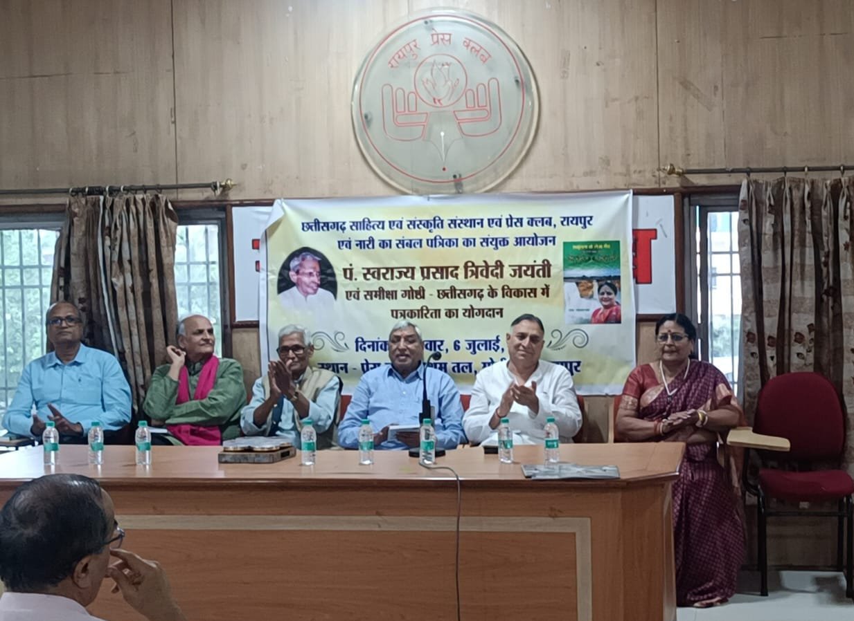 रायपुर/छत्तीसगढ़ साहित्य एवं संस्कृति संस्थान, प्रेस क्लब रायपुर और नारी का संबल पत्रिका के संयुक्त तत्वावधान में पत्रकारिता और साहित्य के पुरोधा पं स्वराज्य प्रसाद त्रिवेदी जयंती एवं समीक्षा गोष्ठी, छत्तीसगढ के विकास में पत्रकारिता का योगदान विषय पर एक दिवसीय गोष्ठी का आयेजन गत दिवस किया गया। समारोह के मुख्य अतिथि राज्य निःशक्तजन वित्त एवं विकास निगम के अध्यक्ष लोकेश कावड़िया ने कहा कि निर्भीक और रचनात्मक पत्रकारिता की नींव पं. स्वराज्य प्रसाद त्रिवेदी ने डाली है। पं. त्रिवेदी छत्तीसगढ़ के स्वाभिमान थे। साहित्य और पत्रकारिता का सुंदर संगम उनके लेखनी में मिलता है। युवा पत्रकार और साहित्यकार उनकी शैली से जुड़कर पत्रकारिता को नया आयाम दें। उन्होंने कहा कि शकुंतला तरार की हलबी गीत संग्रह शकुंतला चो लेजा गीत बस्तर को जानने समझने के लिए महत्वपूर्ण संग्रह है। इससे हलबी की समृद्धि बढ़ रही है।