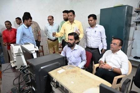 जांजगीर-चांपा । कलेक्टर जन्मेजय महोबे ने आज बम्हनीडीह के तहसील कार्यालय, जनपद पंचायत कार्यालय एवं कृषक सेवा सहकारी समिति मर्यादित में चल रहे कृषक पंजीयन कार्य का औचक निरीक्षण किया। उन्होंने अधिकारियों को निर्देशित किया कि राजस्व के छोटे-छोटे प्रकरणों का तुरंत निराकरण किया जाए। निरीक्षण के दौरान उन्होंने तहसील कार्यालय में नामांतरण, अविवादित व विवादित बंटवारे, अभिलेख दुरूस्ती, त्रुटि सुधार, सीमांकन से संबंधित प्रकरणों की स्थिति की विस्तृत जानकारी ली।