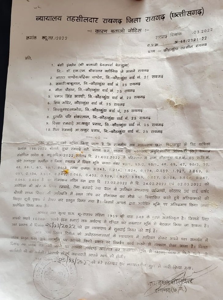दरअसल, रायगढ़ में अवैध कब्जे और निर्माण को लेकर हाईकोर्ट में याचिका दायर की गई है। रायगढ़ तहसील कोर्ट ने 23 से 24 फरवरी और 2 मार्च को सीमांकन दल गठित कर कौहाकुंडा गांव में जांच कराई थी। कई लोगों के पास अवैध कब्जे मिले थे। इसके बाद कोर्ट की ओर से 10 लोगों को नोटिस जारी किया गया। तय तारीख पर कोर्ट में हाजिर न होने पर 10 हजार रुपये जुर्माना लगाने के साथ ही उन्हें बेदखल करने की चेतावनी दी गई। साथ ही निर्माण पर भी रोक लगा दी गई।