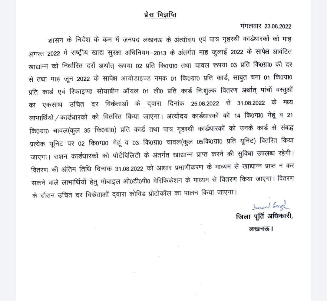 गौरतलब है कि कोरोना साल में (साल 2020 में) केंद्र सरकार की तरफ से राशन कार्ड धारकों के लिए प्रधानमंत्री गरीब अन्न कल्याण योजना के तहत नियमित राशन के अतिरिक्त प्रति यूनिट 5 किग्रा गेहूं-चावल का फ्री राशन वितरण शुरू किया गया था। इसके बाद उत्तरप्रदेश की योगी सरकार ने भी नियमित वितरण होने वाले राशन को फ्री कर दिया था।