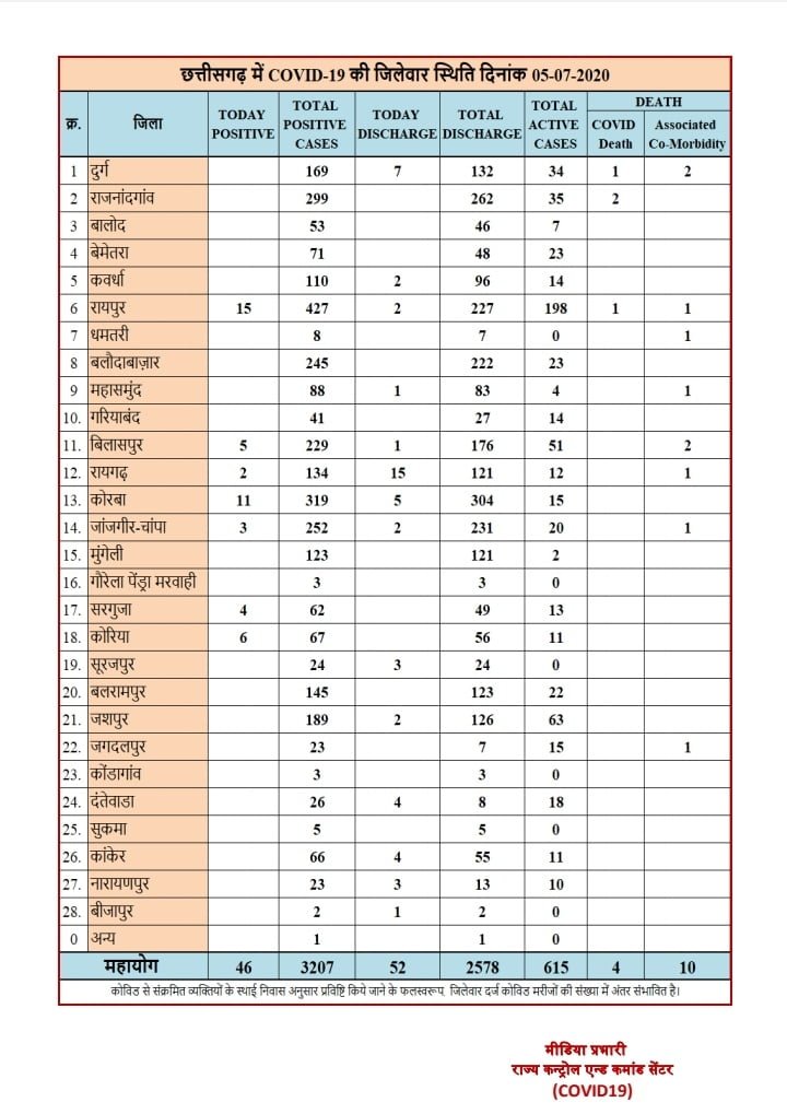 रायपुर 05 जुलाई। प्रदेश आज शाम 6 : 00 बजे की रिपोर्ट के अनुसार 46 कोरोना पॉजिटिव मरीज की पहचान की गई है जिसमे जिला रायपुर से 15, कोरबा से 11, कोरिया से 06, बिलासपुर से 05, सरगुजा से 04, जांजगीर छापा से 03 रायगढ़ से 02 की पुष्टि हुई है।