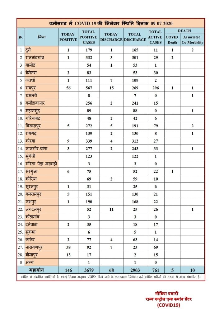 रायपुर 09 जुलाई। आज प्रदेश में 146 नए कोरोना पॉजिटिव मरीज़ों की पहचान हुई. जिसमे रायपुर से 56, नारायणपुर से 38, बीजापुर से 13, कोरबा से 9, सरगुजा से 6, बलरामपुर-बिलासपुर से 5-5, जांजगीर-चंपा से 3, दंतेवाड़ा-कांकेर-बेमेतरा से 2-2 और दुर्ग-राजनांदगांव-कवर्धा-सूरजपुर व जशपुर से 1-1 मरीज शामिल है. वहीं 68 मरीज़ स्वस्थ होने के उपरांत आज डिस्चार्ज हुए। राज्य में कुल पॉजिटिव मरीज़ों की संख्या 3679 है व एक्टिव मरीज़ों की संख्या 761 है।